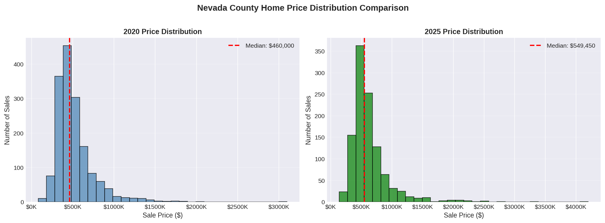 From 2012 to 2025, Nevada County median home prices have increased 140%, from $229,000 to $549,450. Notably, the market has essentially moved sideways since 2022—a four-year period of stability unprecedented in the post-recession era.