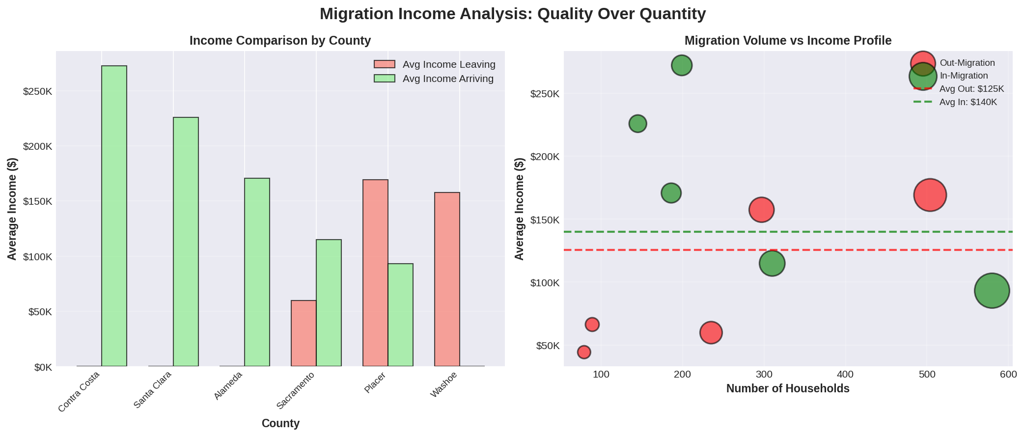Nevada County gained 75 net households from Sacramento County, with those arriving ($114,903 average) earning nearly double those departing ($59,817). This pattern reinforces Nevada County's position as an "upgrade" destination for Sacramento-area residents.