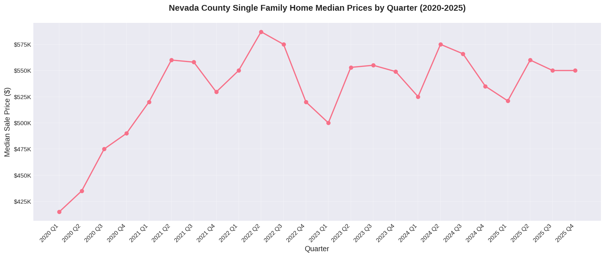 The median sale price for single-family homes in Nevada County ended 2025 at $549,450, essentially unchanged from 2024's $550,000 (-0.1%). This marks the third consecutive year of price stability following the post-pandemic correction: