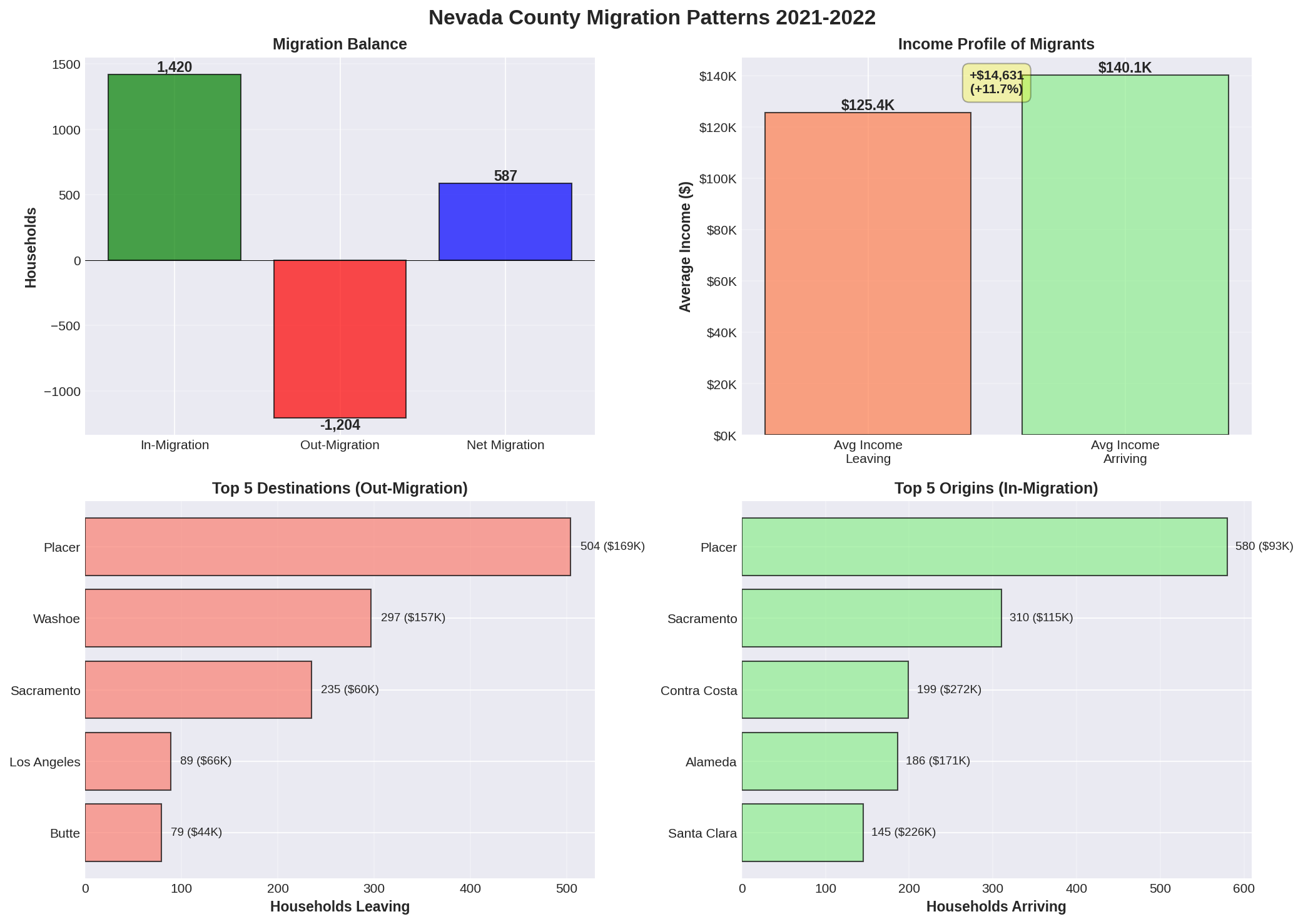 New IRS data from 2021-2022 (the most recent available) reveals the demographic forces underpinning Nevada County's market resilience. The county experienced net positive migration of 587 households, with incoming residents earning significantly more than those departing.